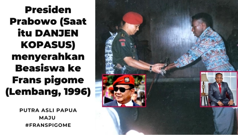 Tahun 1996. Lembang, Bandung. Sebuah foto langka kembali beredar. Dalam foto itu, Letjen TNI Prabowo Subiantoโsaat menjabat Komandan Jenderal Kopassusโmenyerahkan beasiswa penuh kepada seorang mahasiswa Papua: Frans Pigome.